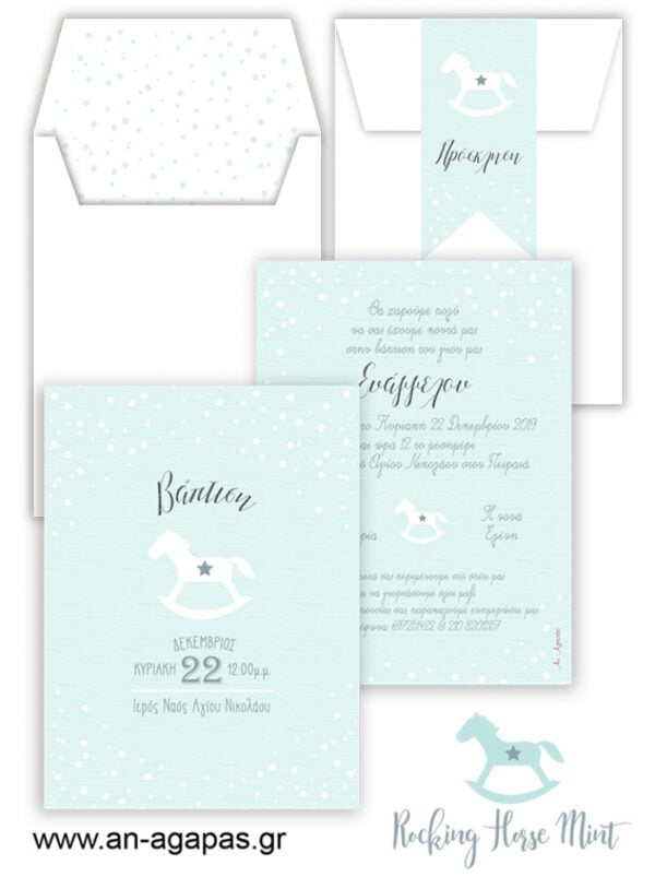 Χειροποίητο προσκλητήριο βάπτισης Mint Rocking Horse. Τα μοναδικά προσκλητήρια με εκτύπωση και στις δύο όψεις και layer με το ίδιο θέμα μέσα στο φάκελο.