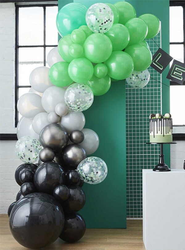 Σύνθεση αψίδας με μπαλόνια σε χρώματα πράσινο, γκρι, ασημί, μαύρο και διάφανο με confetti, σε διάφορα μεγέθη.