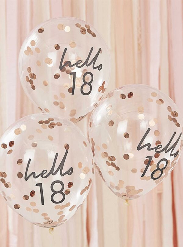 Διάφανα μπαλόνια που αναγράφουν “hello 18”, προγεμισμένα με rose gold confetti.